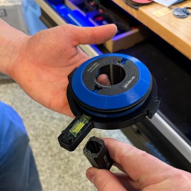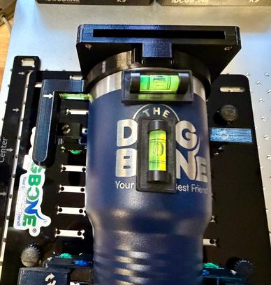 Insert the lid adapter on the appropriate tumbler (30oz is pictured). You will then adjust the risers to level the tumbler (or item) for the area you are intending to laser. You will set the tail on each wing and adjust the tail to be level on each side. With all the bubble levels centered, simply adjust your focus, follow all your laser manufacturers safety precautions, wear the right PPE, use appropriate smoke/VOC/partical mitigation, and laser the top. Flip to other side. Laser the bottom.